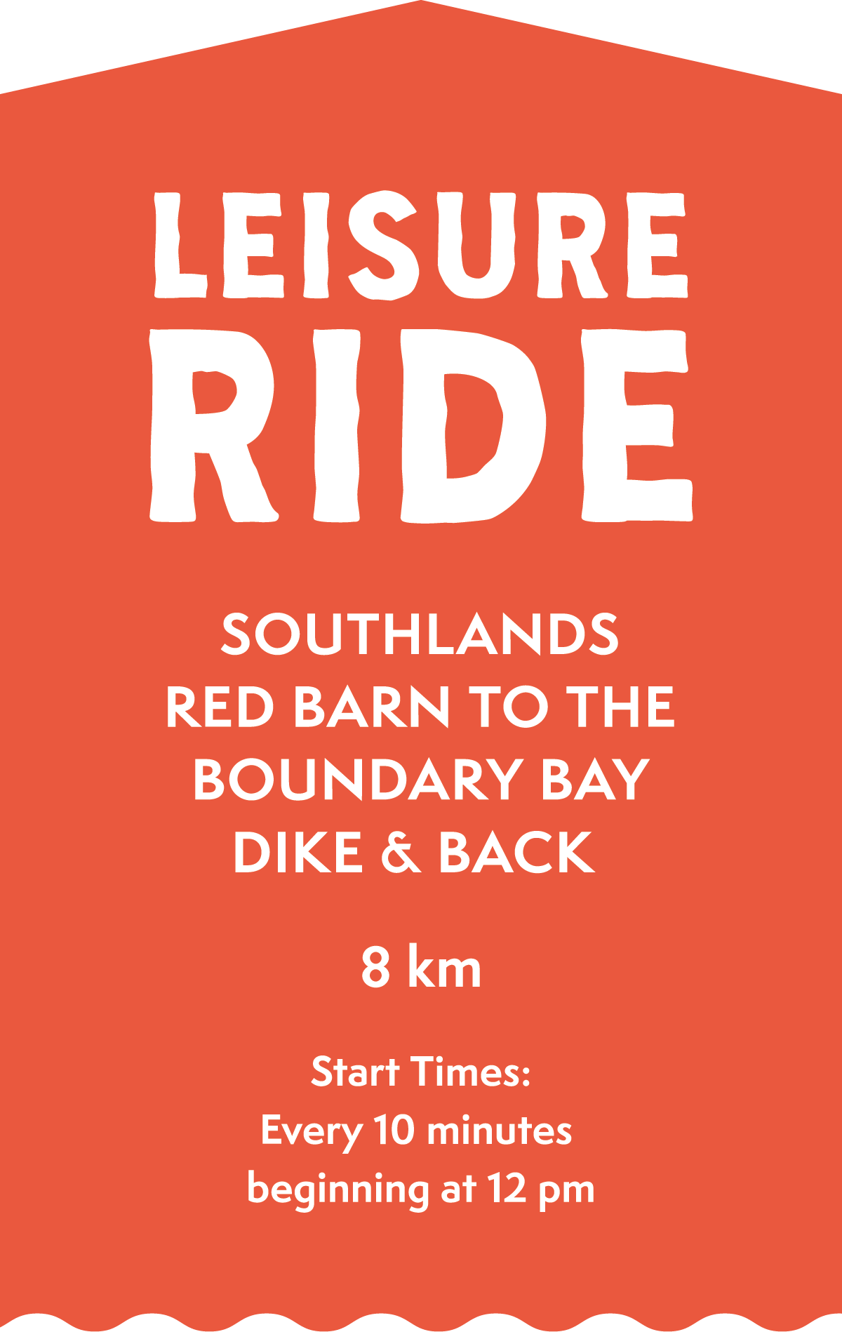 Leisure Rides begin at 12:05 pm, with riders departing in waves every 10 minutes.